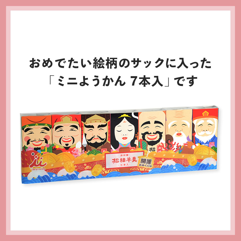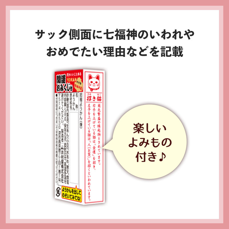 ようかんのそれぞれのサック側面には七福神のいわれやおめでたい理由を記載し、