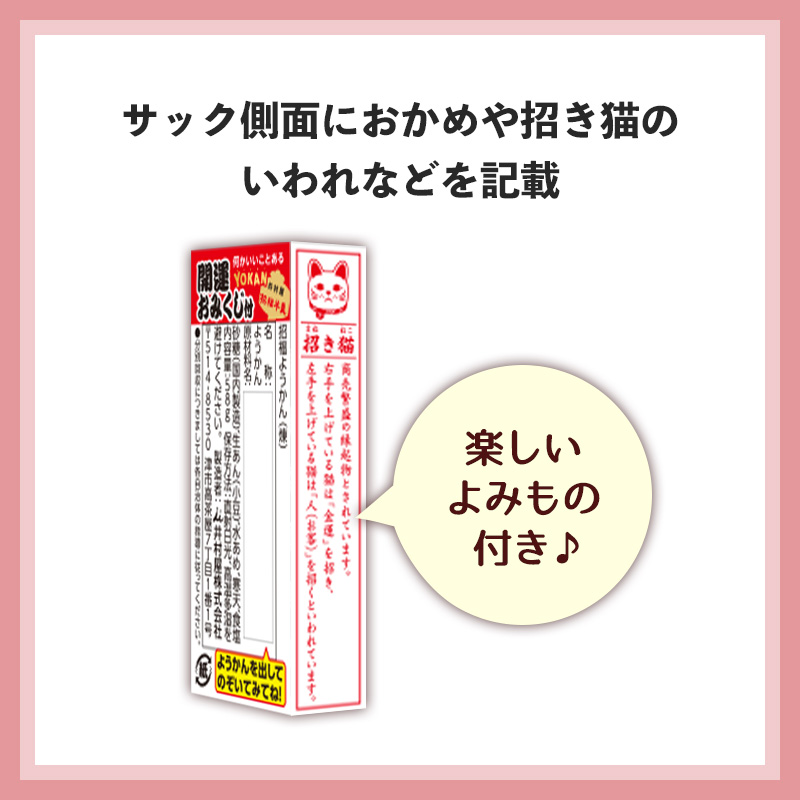 サック側面には干支やおかめ、招き猫のいわれやおめでたい理由を記載し、