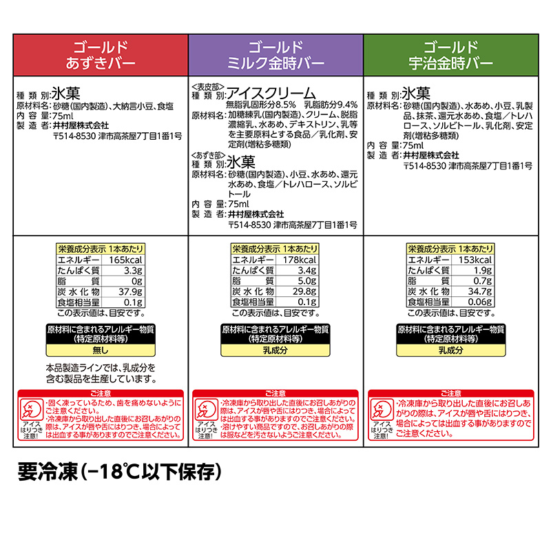 (ゴールドあずきバー・ゴールド宇治金時バー・ゴールドミルク金時バー)
