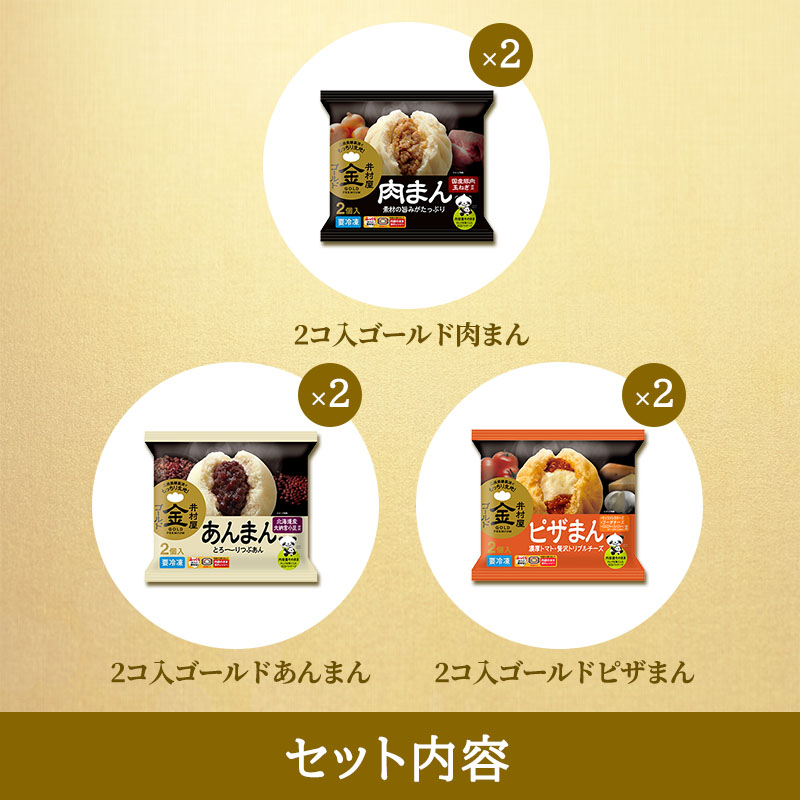 生地、具材がおいしいワンランク上のゴールドシリーズ3種類(肉まん・あんまん・ピザまん)が2パックずつ入ったアソートセットです。